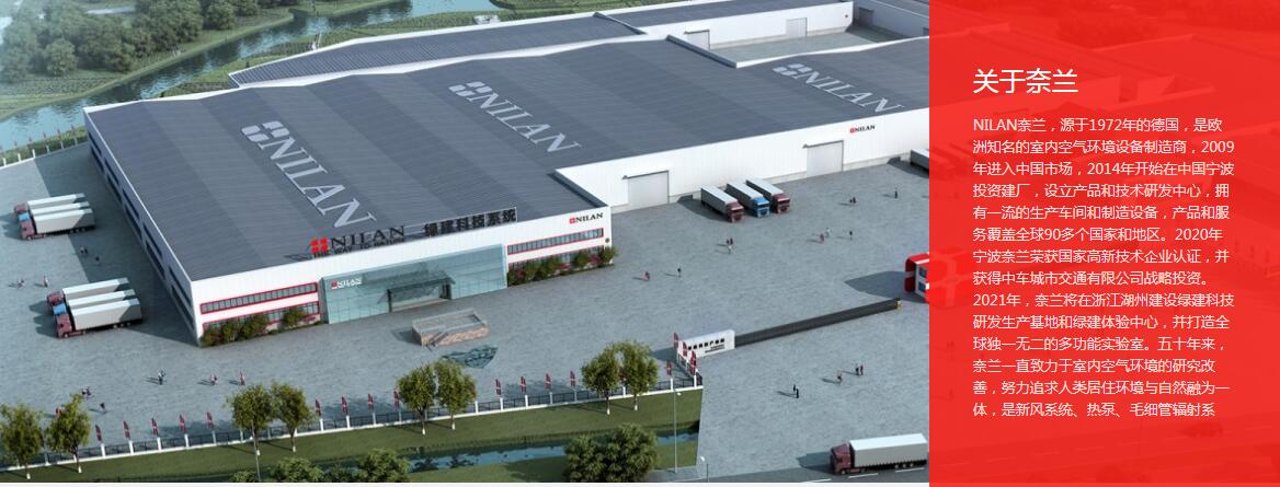 寧波奈蘭環(huán)境系統(tǒng)有限公司(NILAN)源于1972年的德國(guó),是歐洲知名的室內(nèi)空氣環(huán)境設(shè)備制造商,2009年進(jìn)入中國(guó)市場(chǎng),2014年開始在中國(guó)寧波投資建廠,設(shè)立產(chǎn)品和技術(shù)研發(fā)中心,擁有一流的生產(chǎn)車間和制造設(shè)備,產(chǎn)品和服務(wù)覆蓋全球90多個(gè)國(guó)家和地區(qū)。2020年寧波奈蘭榮獲國(guó)家高新技術(shù)企業(yè)認(rèn)證,并獲得中車城市交通有限公司戰(zhàn)略投資。2021年,奈蘭將在浙江湖州建設(shè)綠建科技研發(fā)生產(chǎn)基地和綠建體驗(yàn)中心,并打造全球獨(dú)一無(wú)二的多功能實(shí)驗(yàn)室。五十年來(lái),奈蘭一直致力于室內(nèi)空氣環(huán)境的研究改善,努力追求人類居住環(huán)境與自然融為一體,是新風(fēng)系統(tǒng)、熱泵、毛細(xì)管輻射系統(tǒng)、被動(dòng)房配套技術(shù)等產(chǎn)品服務(wù)的優(yōu)質(zhì)品牌廠家,同時(shí)在健康綠色住宅領(lǐng)域有著深厚沉淀,奈蘭健康住宅七度空間一體化解決方案,即“THONFIE”毛細(xì)七恒系統(tǒng),在國(guó)內(nèi)外民、商、政等各領(lǐng)域有著豐富的項(xiàng)目案例應(yīng)用實(shí)踐經(jīng)驗(yàn),深受行業(yè)認(rèn)可和用戶喜愛——奈蘭,讓家融于自然!